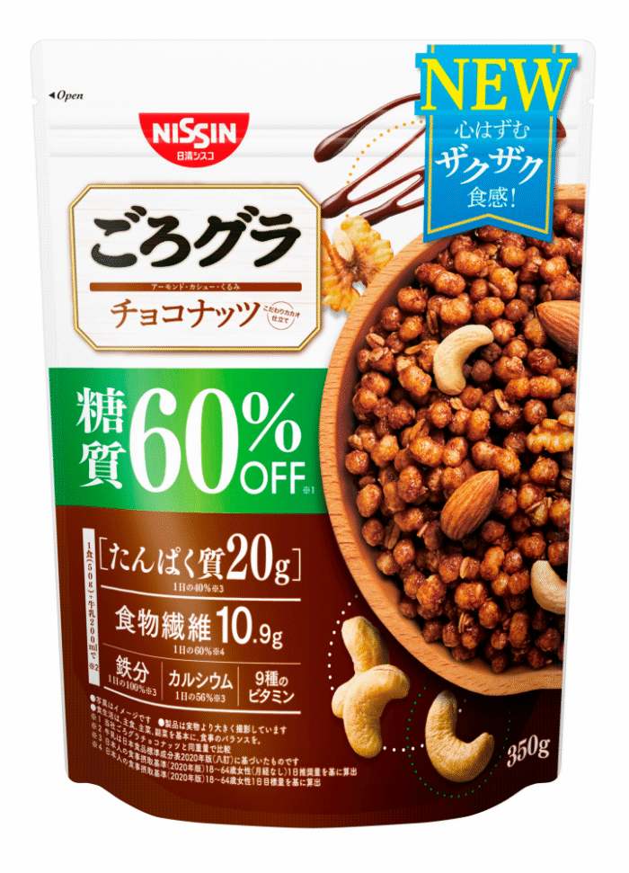 「ごろグラ チョコナッツ」と比べて (同重量で比較) 糖質の量を60%オフしながら、さらにプロテイン、食物繊維、鉄分、カルシウムもしっかり取ることができる “健康志向のグラノーラ” です。