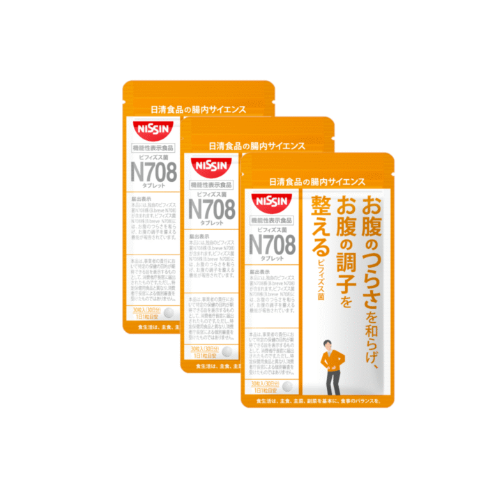 「ビフィズス菌N708 タブレット」は、日清食品独自の「ビフィズス菌N708株(B.breve N708)」を配合した機能性表示食品です。 「ビフィズス菌N708」には、お腹のつらさを和らげ、お腹の調子を整える機能が報告されています。1粒当たりに「ビフィズス菌N708株」を約40億個配合した経口摂取用タブレットです。(1日1粒目安、約30日分)