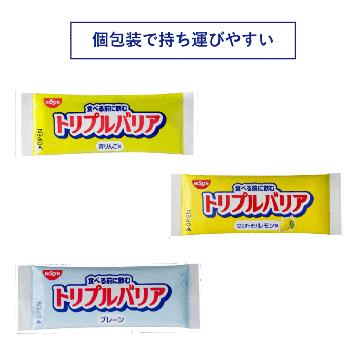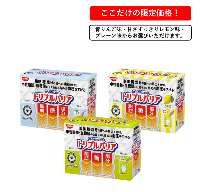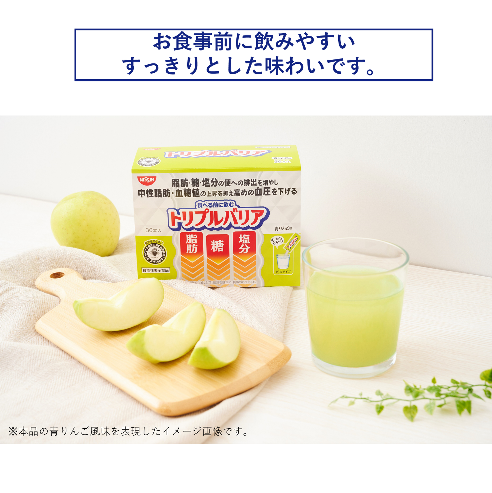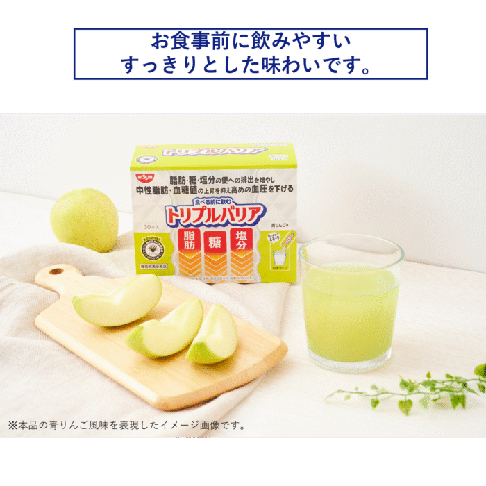 食べる前に飲むと、食事で摂った脂肪・糖・塩分の便への排出を増やし、食後の中性脂肪・血糖値の上昇を抑え、高めの血圧を下げる機能がある、日本初の機能性表示食品です。 「青りんご味」「甘さすっきりレモン味」「プレーン」からお好きな味をお選びいただけます。携帯に便利なスティック30本入りです。